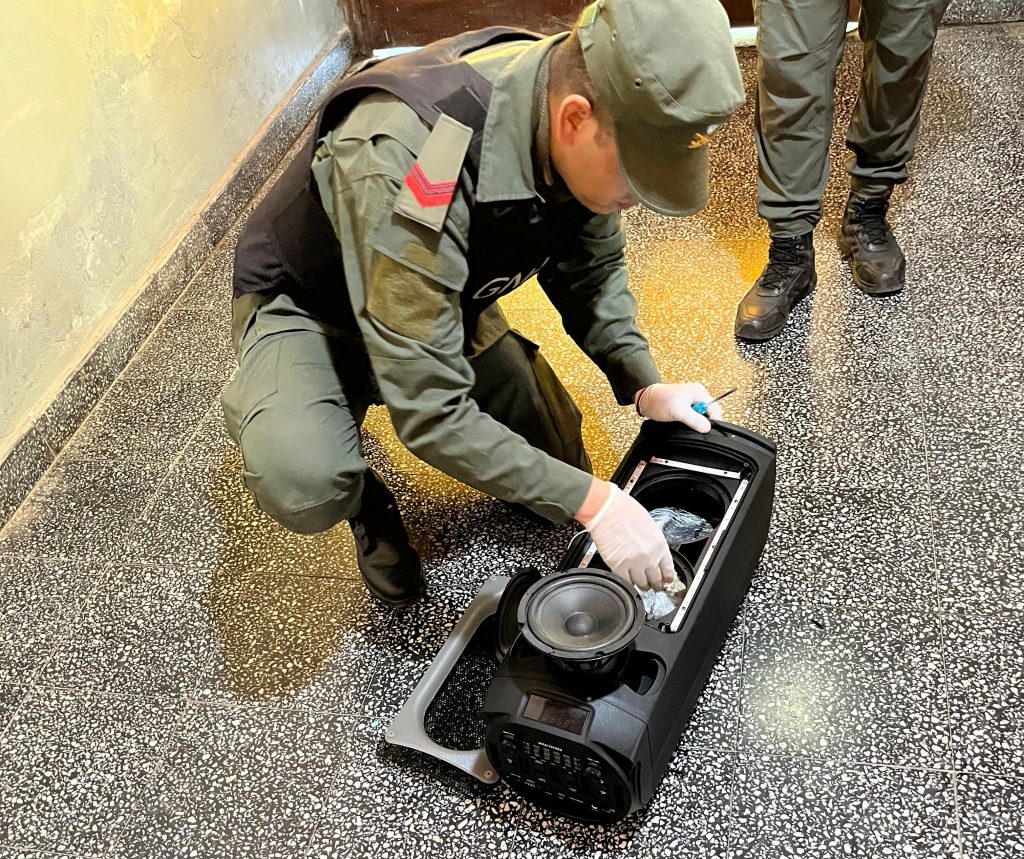 Ante testigos, los gendarmes abrieron el parlante y extrajeron de su interior cuatro paquetes envueltos en cinta negra y film, que contenían una sustancia blancuzca.