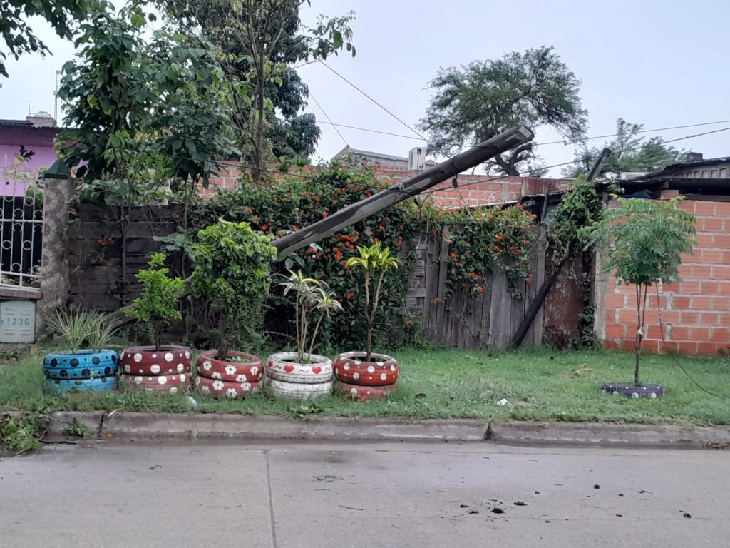 Sobre la calle 25 de Mayo al 1.230, en la semana quedó un poste prácticamente en el suelo, apenas sostenido por los cables, siendo un verdadero peligro para los vecinos. No tiene ninguna identificación para determinar a qué servicio pertenece.