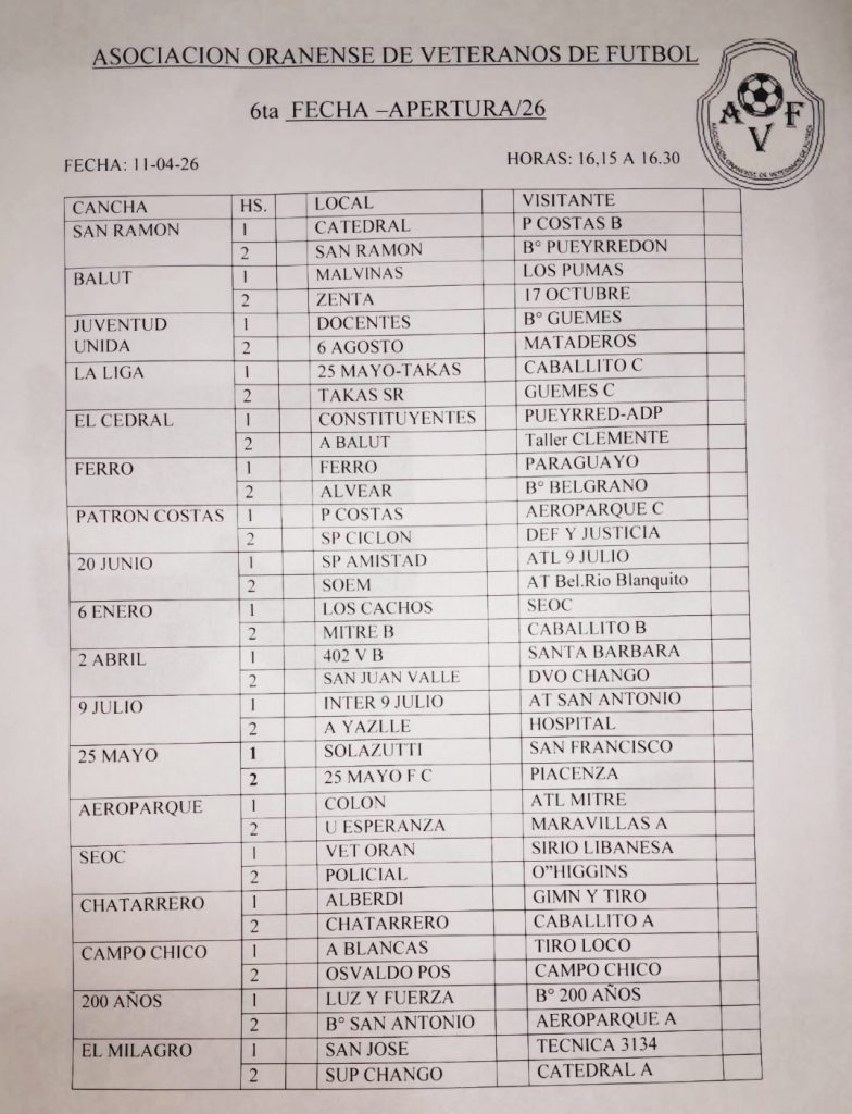 Este sábado 11 de abril va una nueva fecha del torneo Apertura del fútbol de veteranos en nuestra ciudad, con jornadas a doble partido en cada cancha, iniciando de 16:15 a 16:30 hs.